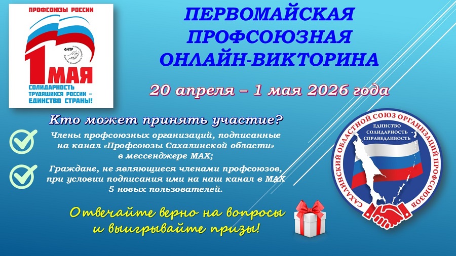 - Викторина проводится для членов профсоюзных организаций нашего региона, входящих в структуру Сахалинского областного союза организаций профсоюзов, подписанных на наш канал в MAX, а также для граждан, не являющихся членами профсоюза при условии подписки ими на наш канал в MAX 5 новых пользователей;
