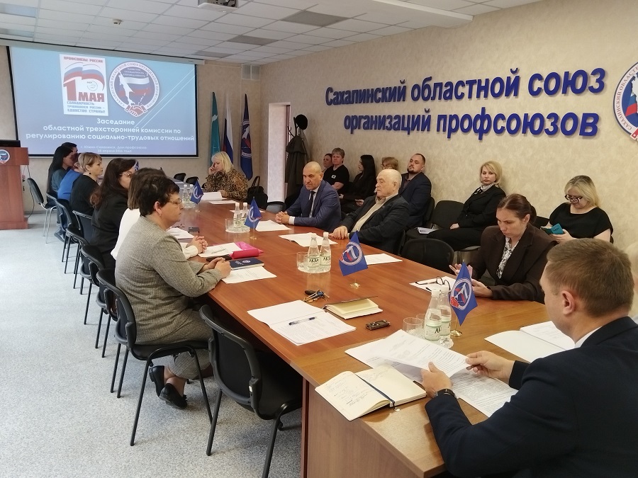 В Доме профсоюзов г. Южно-Сахалинска сегодня состоялось заседание областной трехсторонней комиссии по регулированию социально-трудовых отношений, приуроченное к Первомаю.