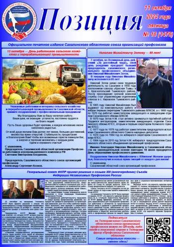 Александр Кознов избран председателем регионального профобъединения. Сахалинскую область с рабочим визитом посетил Председатель ФНПР Сергей Черногаев. Об этом и не только - в новом выпуске "Позиции".